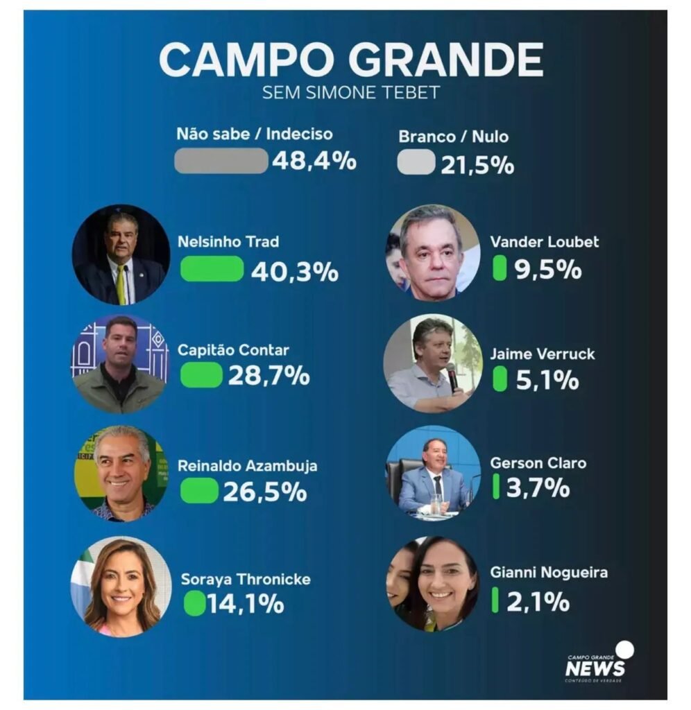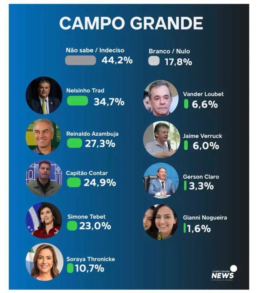 No primeiro cenário apresentado, 62% dos entrevistados afirmaram não saber em quem votar ou disseram que pretendem votar em branco ou anular o voto. Entre os nomes citados, Nelsinho Trad aparece na liderança, com 34,7% das intenções, seguido pelo ex-governador Reinaldo Azambuja, com 27,3%. Na sequência surgem Renan Contar, com 25,9%, e Simone Tebet, com 23%.